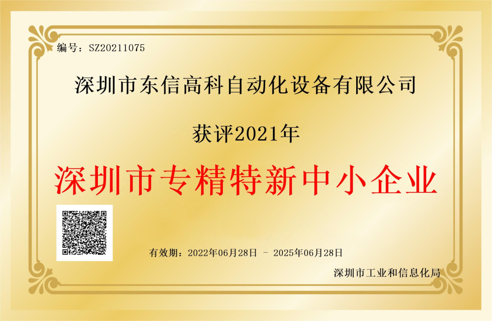 深圳市東信高科自動化設備有限公司獲評2021年深圳市專精特新中小企業,證書有效期為2022年06月28日至2025年06月28日。